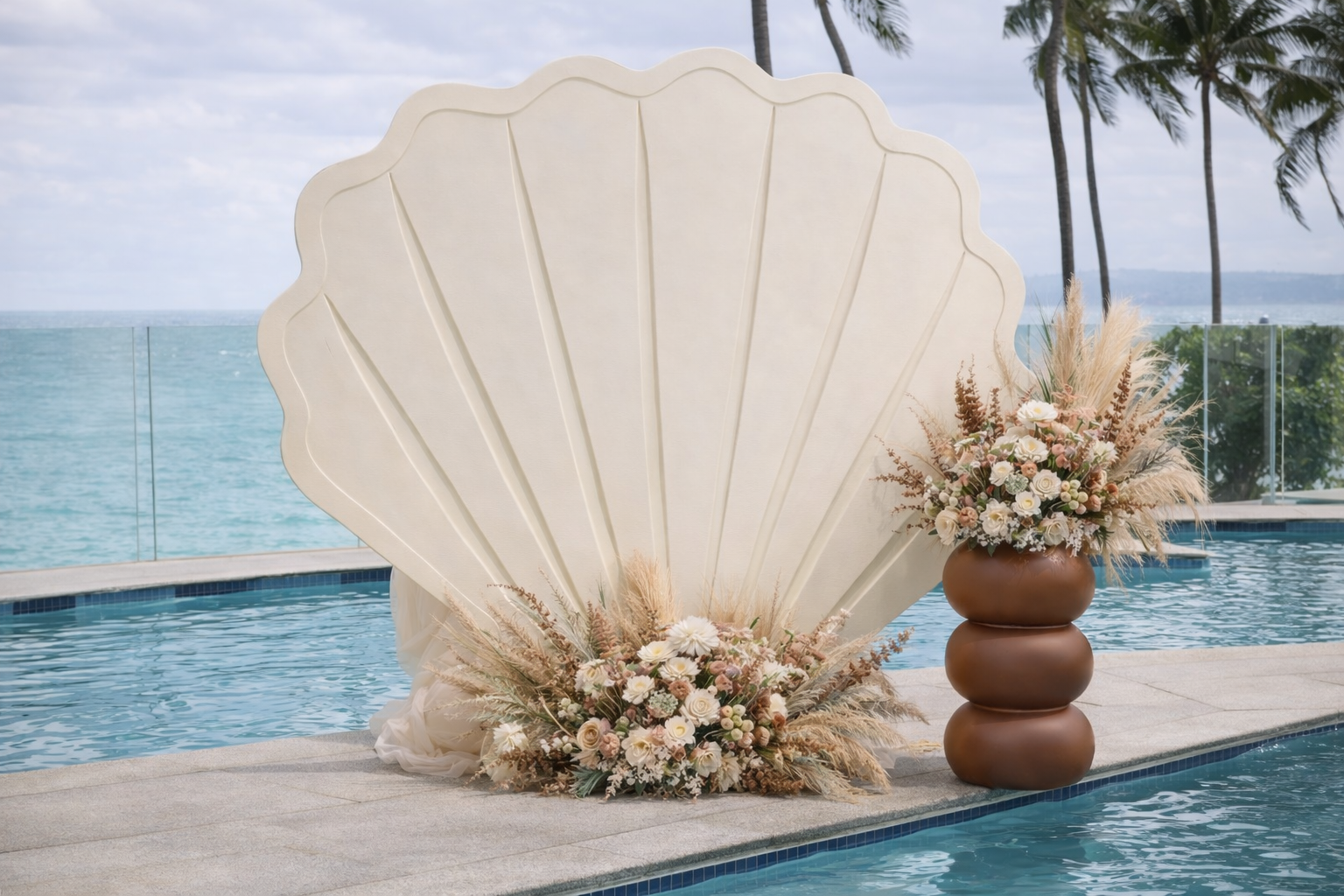 A sculpted statement piece finished in a warm sandstone tone, is perfect for beach celebrations, intimate dinners, and modern coastal events. Designed to anchor your scene with effortless elegance and a touch of island magic.